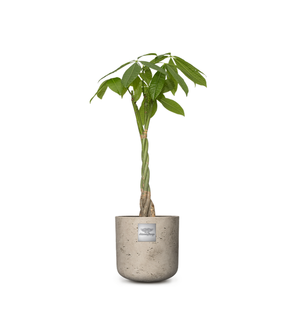 Pachira aquatica, auch bekannt als „Glückskastanie“, hat meistens zwei bis drei ineinander verflochtene oder gedrehte Stämme und tiefgrüne Blätter, die einer Hand mit fünf Fingern ähneln. Die Pflanze wächst zügig und bildet recht schnell ihre schön volle Blattkrone. Der Aufbau ist dank der großen Blätter, die an langen Blattstielen stehen, äußerst beeindruckend. So wirkt die Pflanze weniger massiv und das Licht kann durch sie hindurchscheinen. Der Zimmerbaum speichert Wasser in seinem Stamm und benötigt darum entsprechend wenig Pflege. Das macht diese kräftige grüne Zimmerpflanze attraktiv für Menschen, die imposantes Grün im Haus lieben, aber sich nicht allzu sehr mit der Pflege beschäftigen wollen.